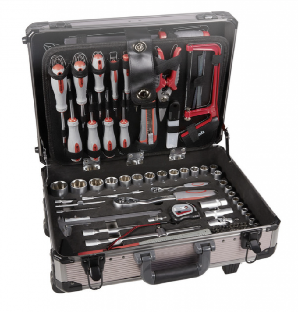 Aber das ist noch nicht alles. Alle Werkzeuge sind übersichtlich und gut sortiert in einem hochwertigen Aluminiumwagen verstaut. Das macht das Finden des richtigen Werkzeugs zum Kinderspiel und hilft dir dabei, deine Arbeit schneller und effizienter zu erledigen. Und das Beste daran? Der Werkzeugwagen ist mit praktischen Rädern und einem herausziehbaren Griff ausgestattet. Das bedeutet, du kannst dein komplettes Werkzeugsortiment ganz einfach zum Arbeitsort transportieren. Kein schweres Schleppen mehr und keine unnötigen Wege zur Werkzeugkiste.