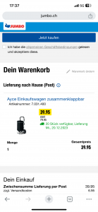 Bei Jumbo gibt’s ab heute wieder neue Aktionen! Zum Beispiel könnt ihr euch so den zusammenklappbaren Einkaufswagen der Eigenmarke ayce für günstige 39.95 Franken inkl. Versand nach Hause bestellen! Normalerweise fallen unter 75 Franken Bestellwert noch 7 Franken Versandkosten an. Jetzt scheinbar nicht mehr mit gratis Versand 🙁