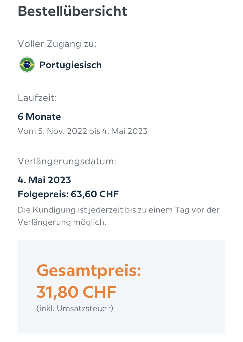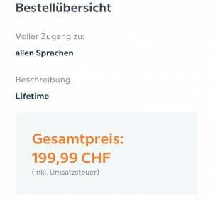 Initial dient das wohl zur Erstellung des Benutzer Profils und kann in der Tat irreführend sein. In den weiteren Schritten des Bestellvorgangs wird das im Screenshot gezeigte „Voller Zugang zu: allen Sprachen“ angegeben, was für mich als Vertragsrelevant gilt. Sollte dem wider Erwarten nicht so sein, kann man ja von der 20 Tage Geld zurück Garantie gebrauch machen. Für vorherige Abklärungen, leistet sicher der Support unter [email protected] für Klarheit. 😊