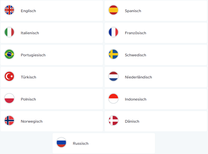 Zur Auswahl stehende Sprachen: Englisch, Spanisch, Italienisch, Französisch, Portugiesisch, Schwedisch, Türkisch, Niederländisch, Polnisch, Indonesisch, Norwegisch, Dänisch, Russisch