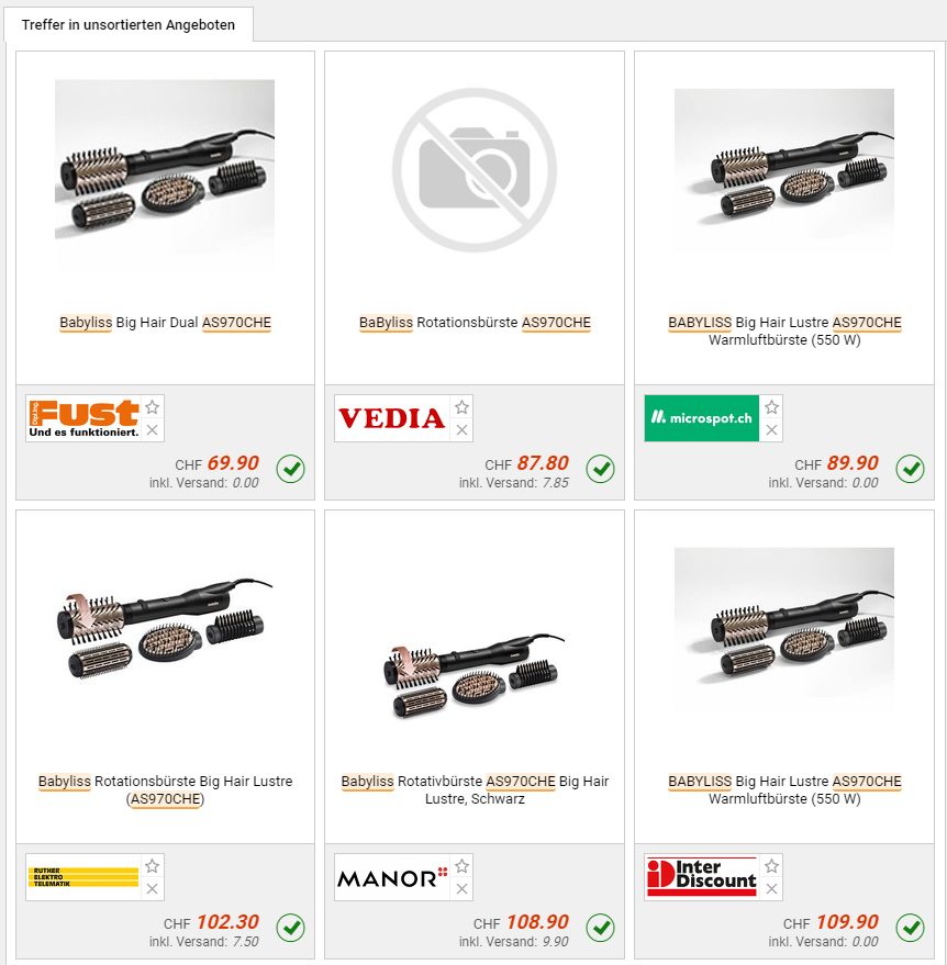 Bei Fust gibts derzeit die Warmluftbürste Babyliss AS970CHE zum Preis von CHF 69.90. Laut toppreise soll der Vergleichspreis sonst bei knapp 88 Franken liegen.