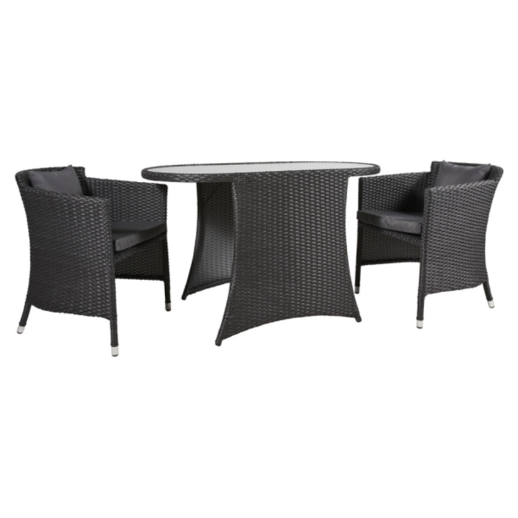 Das dreiteilige Set besteht aus einem grosszügigen Tisch und zwei komfortablen Stühlen, die mit einer maximalen Belastbarkeit von 120 kg sehr stabil sind. Die Oberflächen sind abwaschbar und witterungsbeständig.