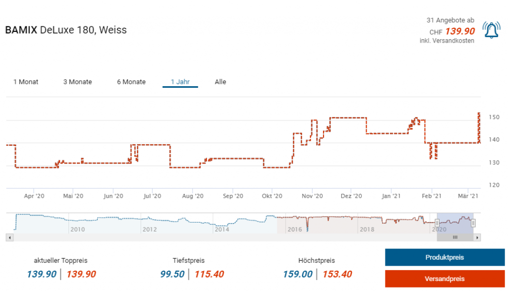 Bei nettoshop gibts derzeit den Stabmixer Bamix 180 Deluxe zum Aktionspreis von 129 Franken. Mit dem bekannten 10 Franken Bon spart ihr zudem zusätzlich. Laut toppreise liegt der Vergleichspreis für den Deluxe-Stabmixer bei 139 Franken.