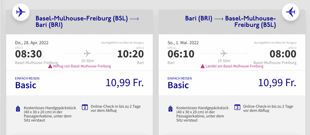 Auch bei Wizzair gibt es momentan günstige Flüge von Basel aus. So zum Beispiel für einen Wochenendtrip nach Bari in der italienischen Region Apulien am Donnerstag, 28.04. hin und zurück am Sonntag, 01.05 für insgesamt 22 Franken.