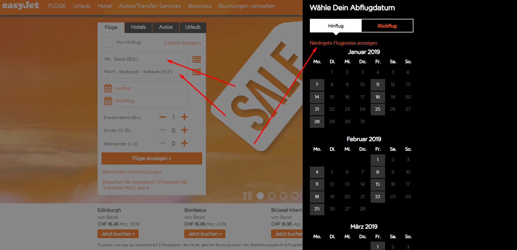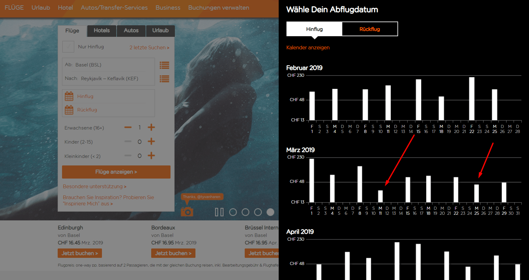 Auf der Easyjet Seite als Abflughafen Basel und als Ziel Reykjavik auswählen. Bei der Datumsauswahl auf den Text “Niedrigste Flugpreise” klicken. Die tiefsten Balken sind am günstigsten.