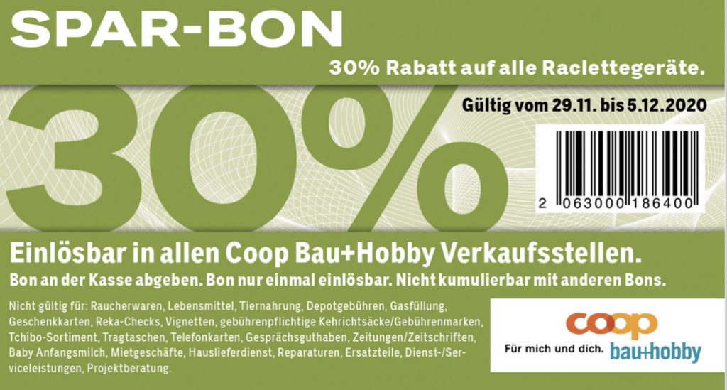 Mit dem Bon erhält man 30% Rabatt bei Bau & Hobby auf alle Raclettegeräte!
