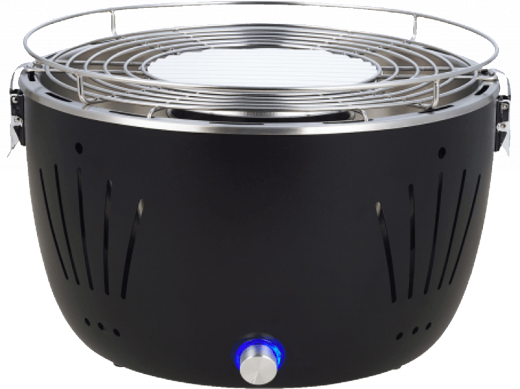 • Batteriebetriebener Lüfter, versorgt die Kohle mit Frischluft. Die Glut wird dadurch permanent belüftet und ermöglicht deshalb ein nahezu rauchfreies Anzünden des Grills.