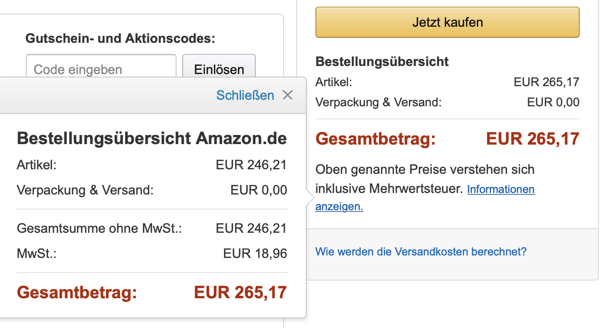 - Es kommen keine weiteren/nachträglichen Kosten (wie z. B. Zoll) auf den zuletzt angezeigten Preis oben drauf