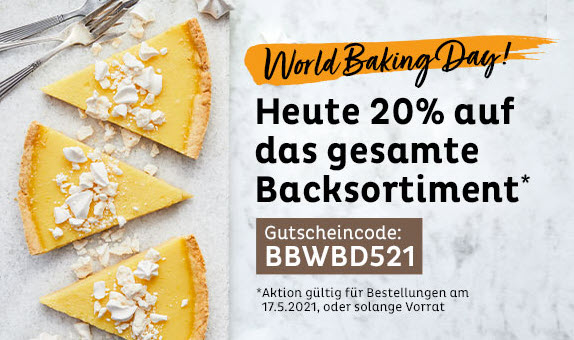 Zum Weltbacktag gibt es nur heute 20% Rabatt auf das gesamte Backsortiment wenn man beim Checkout den Gutscheincode BBWBD521 verwendet.