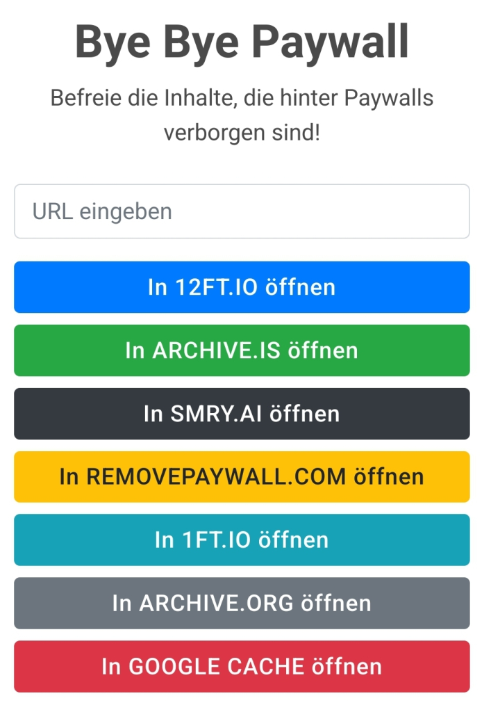 Hallo zusammen. Wenn man einen Artikel lesen, so kommt sehr oft eine Paywall. Wenn man aber nicht ein ganzes Abo lösen will für einen Artikel so empfehle ich diesen Link hier: