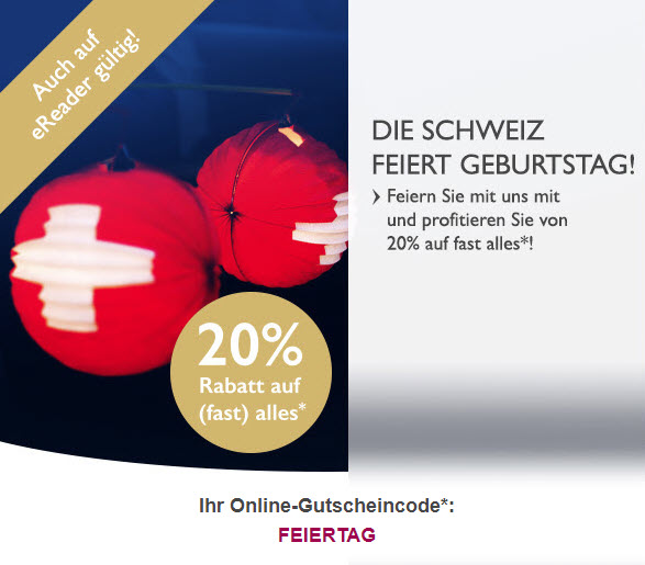 Bei Orell Füssli gibt es anlässlich des bevorstehenden Nationalfeiertages mit dem Gutscheincode SOMMERFERIEN 20% Rabatt auf fast alles (dieses Mal auch auf e-Reader).