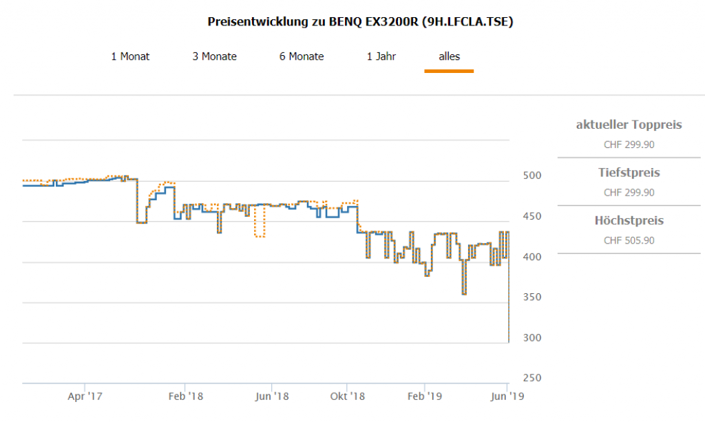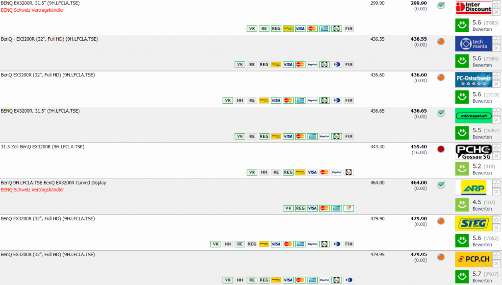 Bei Interdiscount gibt’s den BENQ EX3200R, 31.5″ Curved Monitor für CHF 299.90 Leider bietet der Monitor nur eine Full HD Auflösung, was aus meiner Sicht etwas wenig ist für die Grösse. Bestpreis war bei CHF 359.90, zweitbester Preis im Moment beträgt CHF 436.55