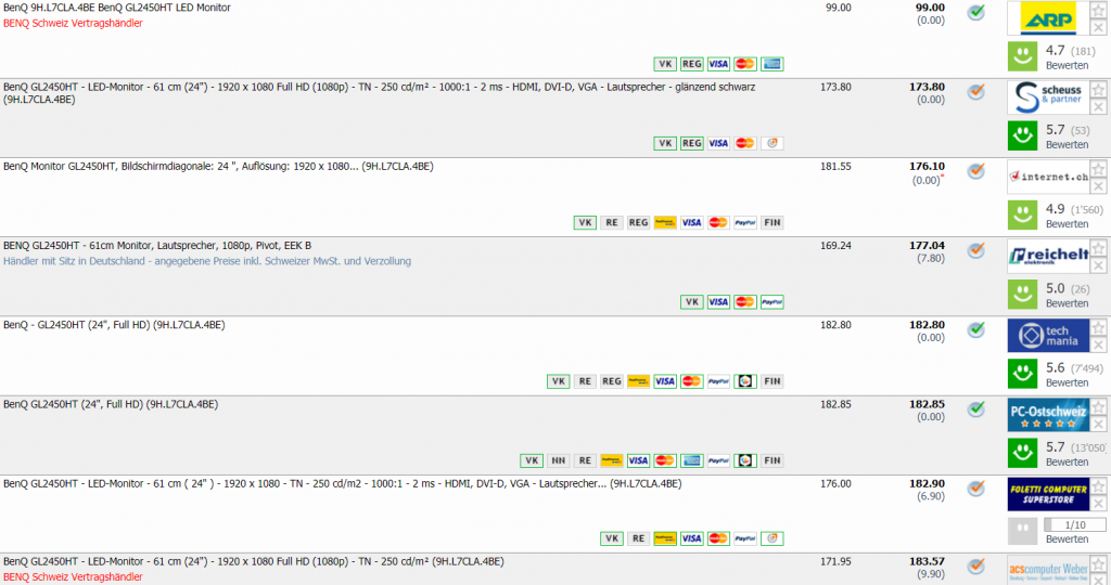 Bei ARP erhält man gerade den BenQ GL2450HT LED Monitor für CHF 99.- Meldet man sich zum Newsletter an, gibt’s einen 10.- Gutschein, der kombinierbar ist. Der zweitbeste Preis für diesen Monitor beträgt CHF 173.80, Bestpreis bisher war bei CHF 149.- Erstaunlich sind auch die Preise der Mitbewerber: digitec: CHF 186.- // microspot: CHF 185.- // MediaMarkt: CHF 209.-