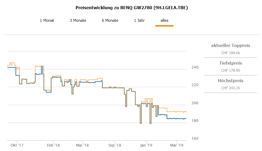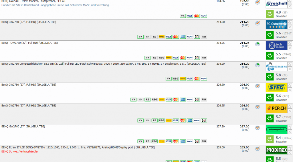 Im Tagesdeal bei digitec erhält man den 27“ BenQ GW2780 Bildschirm. Leider ist die Auflösung mit Full HD aus meiner Sicht für 27“ zu knapp bemessen und ich würde ihn daher nicht kaufen. Trotzdem ein attraktiver Preis mit CHF 139.- Zweitbester Preis in der Schweiz ist laut toppreise bei CHF 192.46 Bestpreis war bei CHF 178.-