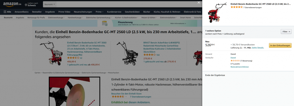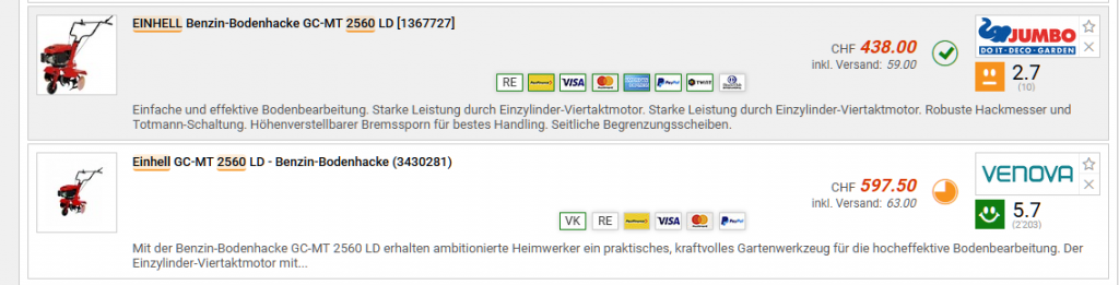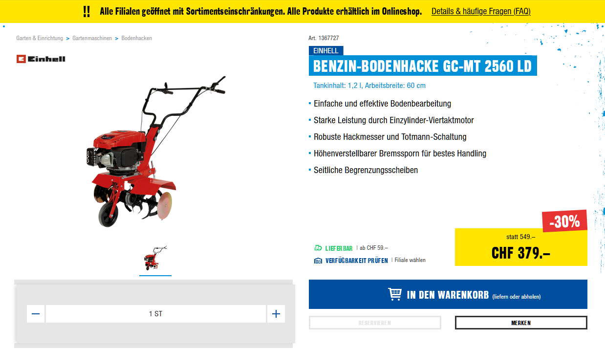Im Jumbo gibt es aktuell die Benzin-Bodenhacke von Einhell Modell GC-MT 2560 LD für den Aktionspreis von CHF 379.00 bei Abholung im Markt. Bei Lieferung kommen noch CHF 59.00 dazu. Vergleichbare Angebote gibt es gemäss toppreise nur bei Venova und einiges teurer. Auch bei Amazon mit Lieferung in die Schweiz ist kein günstigeres Angebot zu finden. Wer also für dieses Jahr etwas im Garten machen will und etwas für den Boden braucht, soll zugreifen.