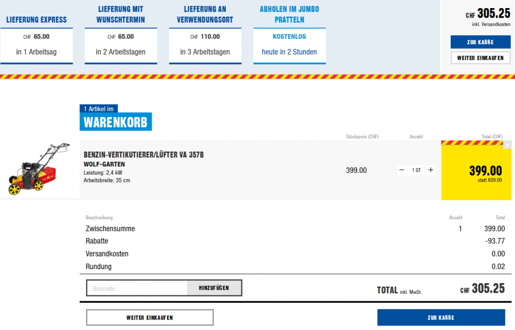So kommt ihr auf einen Preis von 305.25 CHF (unbedingt gratis Filialabholung wählen, sonst zahlt ihr 65.- CHF Versandkosten).