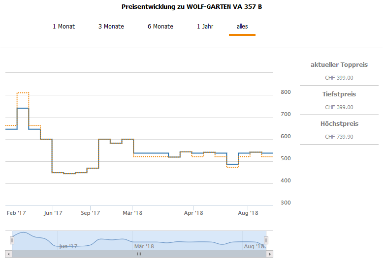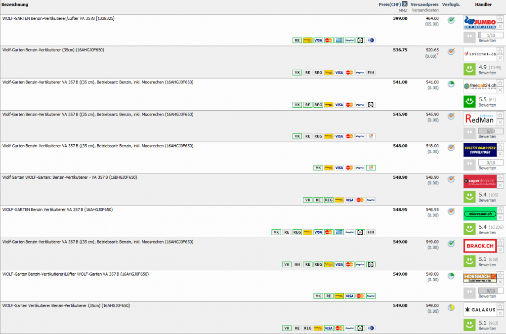 Gemäss toppreise gab es den Vertikutierer bislang nie günstiger als für 444.15 CHF, der zweitbeste Preis liegt aktuell bei 536.75 CHF.