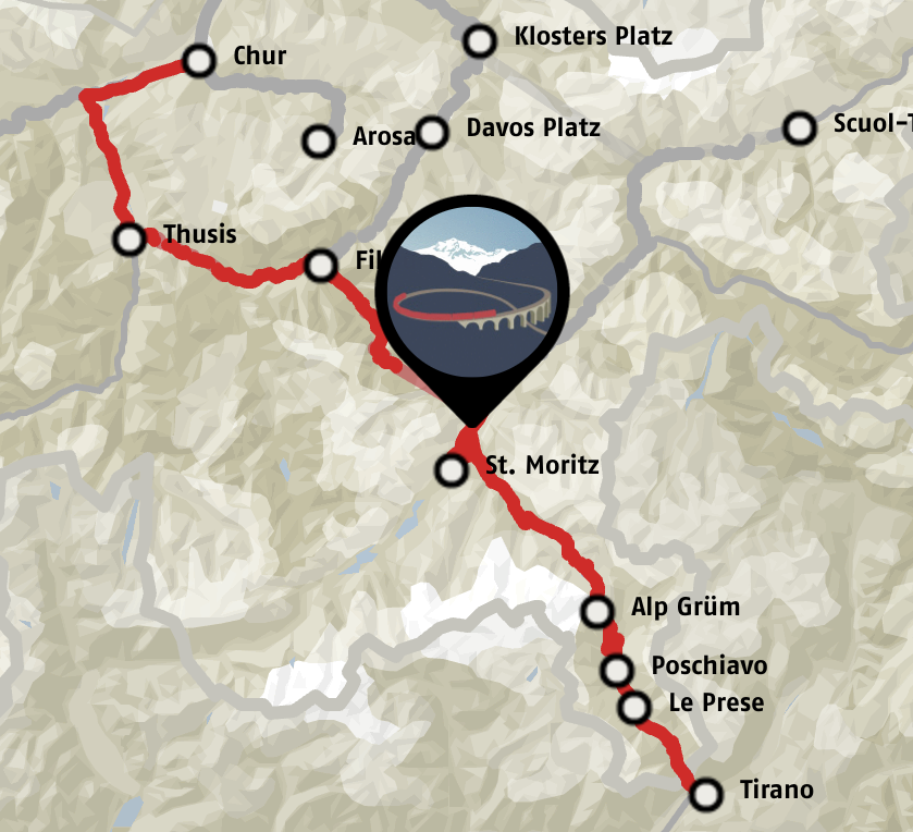 Die Fahrt von Chur nach Tirano dauert etwas mehr als vier Stunden. Ihr könnt aber auch in Tiefencastel, Filisur, Bergün/Bravuogn oder Pontresina zusteigen und/oder auch nur bis Poschiavo oder Le Prese fahren.