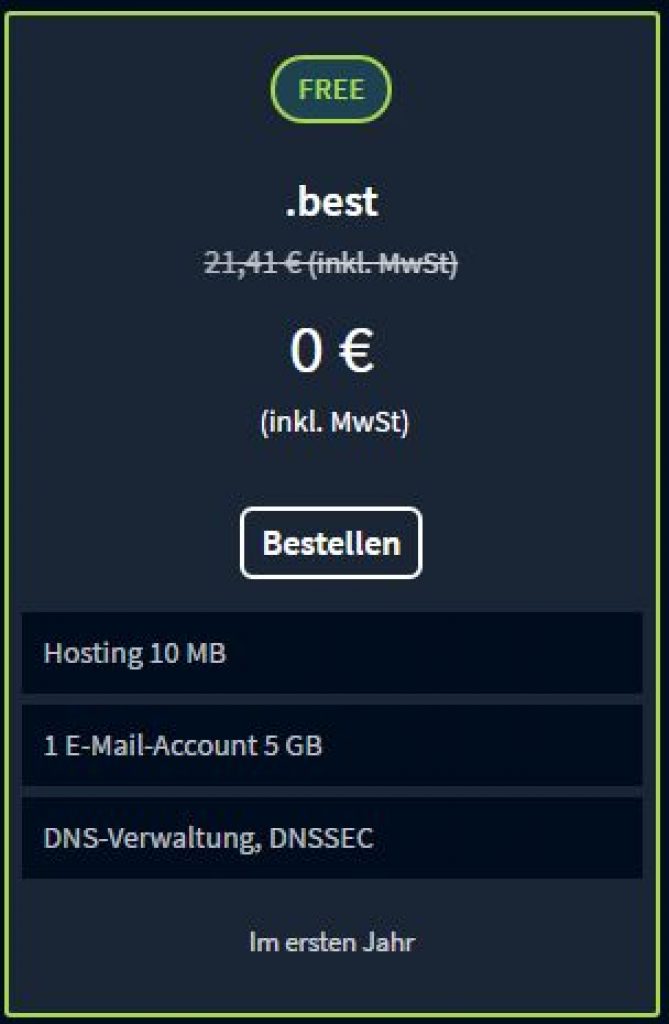 Gültig für Neuregistrierungen bis am 03.12.2019 auf der Website von OVH. Zudem gibt es dazu ein Mailaccount mit 5 GB Speicher und 10 MB Webhosting (Onepage). Das Angebot ist auf eine .best-Domain pro Kundenkennung (NIC) begrenzt.
