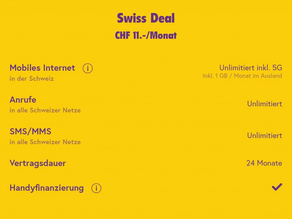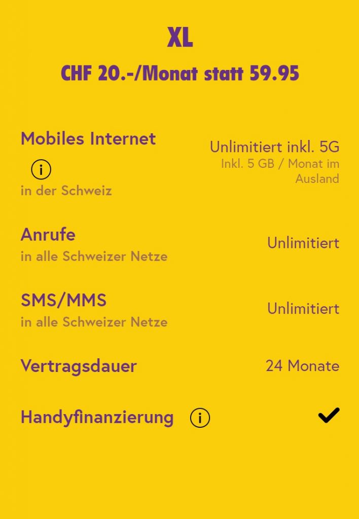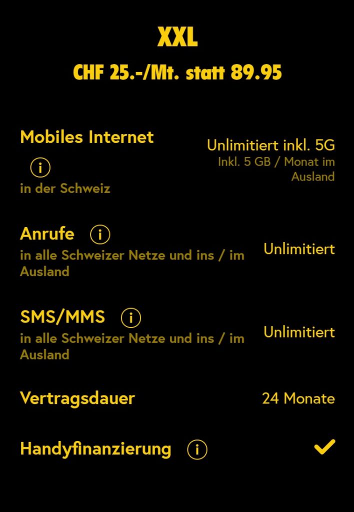 Unlimitierte Internet-Daten in der Schweiz, davon 40GB 5GUnlimitierte Anrufe in der SchweizUnlimitierte SMS und MMS in der Schweiz1GB Internet-Daten gültig für GB, EU, US, CA, NO und LI