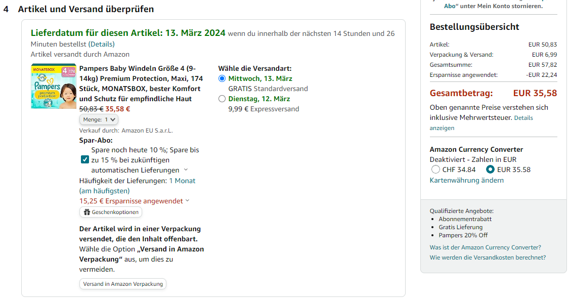 - Für Lieferungen in die Schweiz wird der Preis erst bei Angabe einer Schweizer Lieferadresse richtig angezeigt (Abzug der Mehrwertsteuer, zuzüglich Versandkosten) resp. beim Checkout an der Kasse (Amazon Frankreich, Italien, Spanien und Grossbritannien). Wir verwenden grundsätzlich den Interbanken-Kurs für die Umrechnung in CHF.