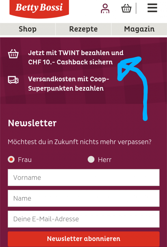 Beim Bezahlvorgang an der Kasse heisst es, bei Zahlung via Twint gebe es einen Cashback von 10.-.