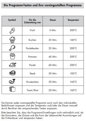 Hier gibt’s zudem noch eine Tabelle mit den Zubereitungszeiten zu verschiedenen Gerichten: