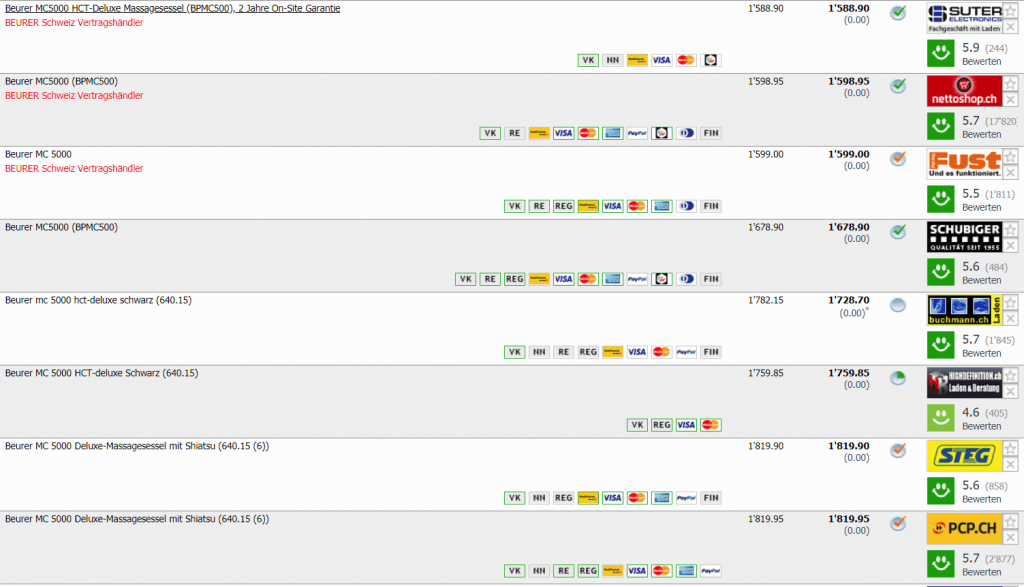 Bei Interdiscount erhält man gerade den Beurer MC 5000 Shiatsu Massagesessel Deluxe (Man gönnt sich ja sonst nichts…) für CHF 1’299.90. Bisheriger Bestpreis lag bei CHF 1’399.90 Zweitbester Preis in der Schweiz laut toppreise liegt bei CHF 1’588.90