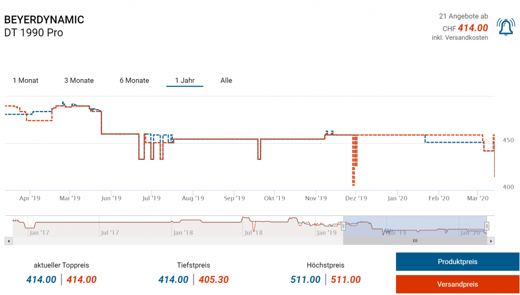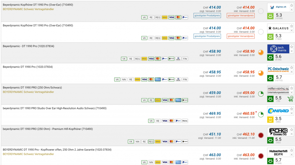 Bei Amazon erhält man den beyerdynamic DT 1990 PRO Over-Ear-Studiokopfhörer (250 Ohm) gerade für umgerechnet CHF 371.90 (Bei Bezahlung mit neon oder Revolut) inklusive Versand und Verzollung. In der Schweiz bezahlt man ab CHF 414.- Bestpreis war bei CHF 405.30