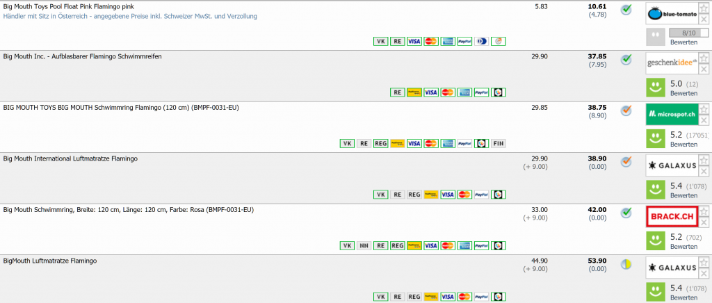 Bei Blue Tomato im SALE gibt’s einen Flamingo-Schwimmring gerade für gut 10 Franken, wenn man ausschliesslich den Flamingo bestellt (Versandkosten: CHF 4.90, Preis Flamingo: CHF 5.80) In der Schweiz kostet der Flamingo ab CHF 29.90
