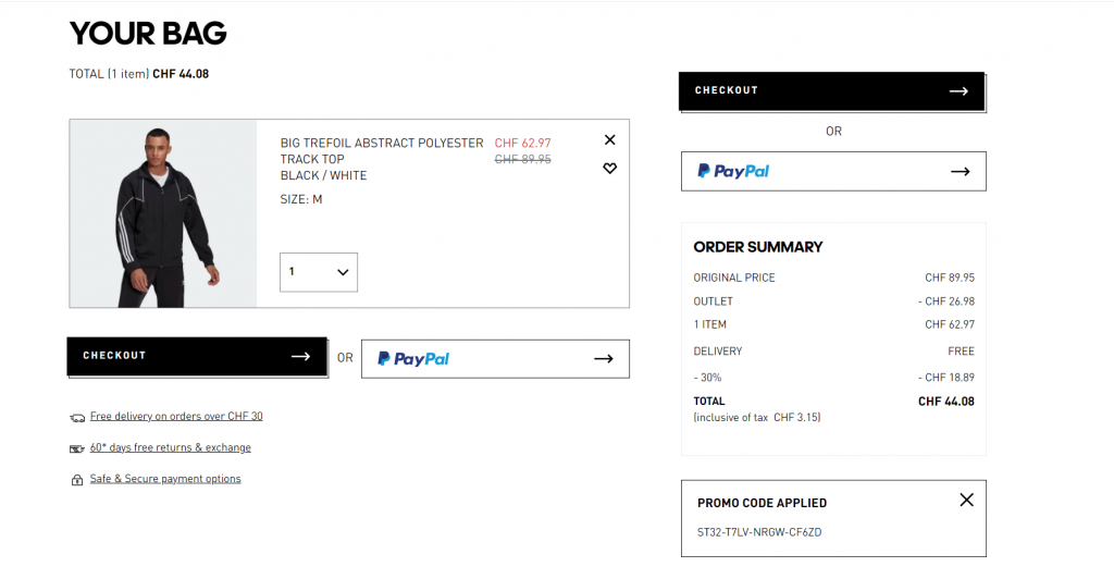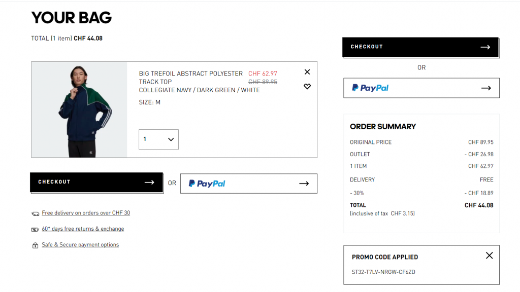 Bei Adidas gibt’s den BIG TREFOIL ABSTRACT POLYESTER TRACK TOP in der Farbe schwarz sowie Navy/Dark Green in allen Grössen für nur CHF 44.08, wen man den personalisierten Preispirat-Gutschein einsetzt. Die Lieferung ist gratis.
