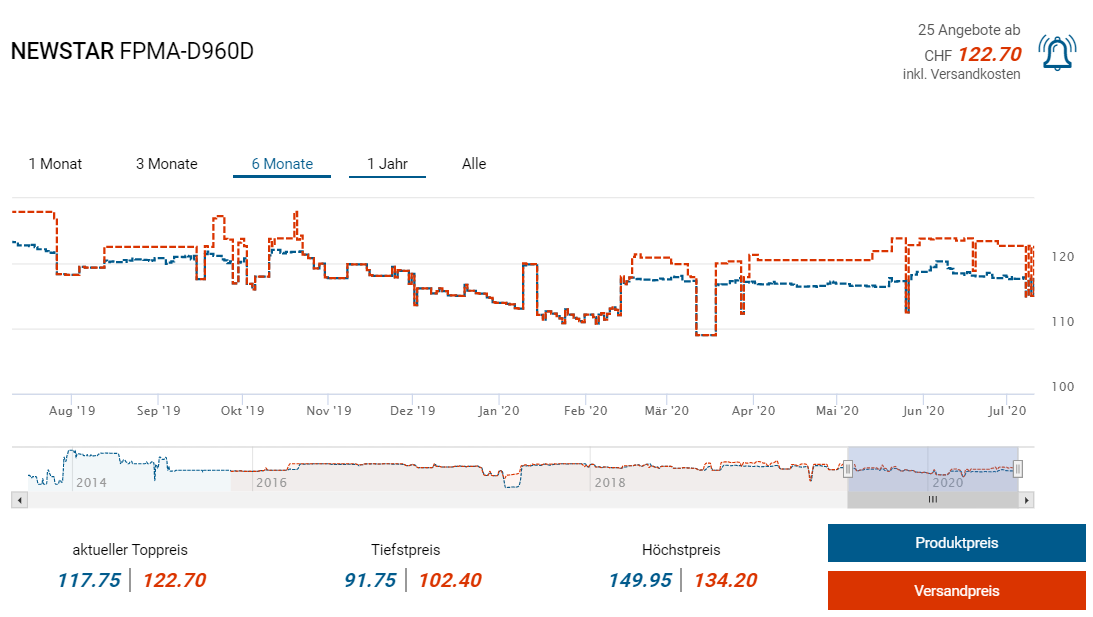 Bei digitec gibts derzeit die Bildschirmhalterung FPMA-D960D von NewStar im Tagesangebot für 99 Franken. Laut toppreise soll es sie bereits einmal für knapp 102 Franken gegeben haben, zuletzt einmal im März für 109 Franken. Den zweitbesten Preis gibts derzeit bei Amazon, da kostet sie ebenfalls knapp 109 Franken.