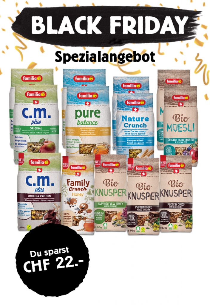 Der Black Friday Deal bietet dir eine grosse Müesli-Vielfalt zu einem exklusiven Spezialpreis! Du erhältst deinen Müesli-Vorrat im Wert von CHF 73.45 für nur CHF 51.40 und sparst somit CHF 22.-!