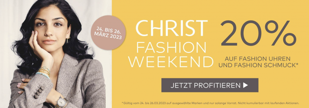 Bei CHRIST gibt es dieses Wochenende 20% Rabatt auf Fashion Uhren und Schmuck.