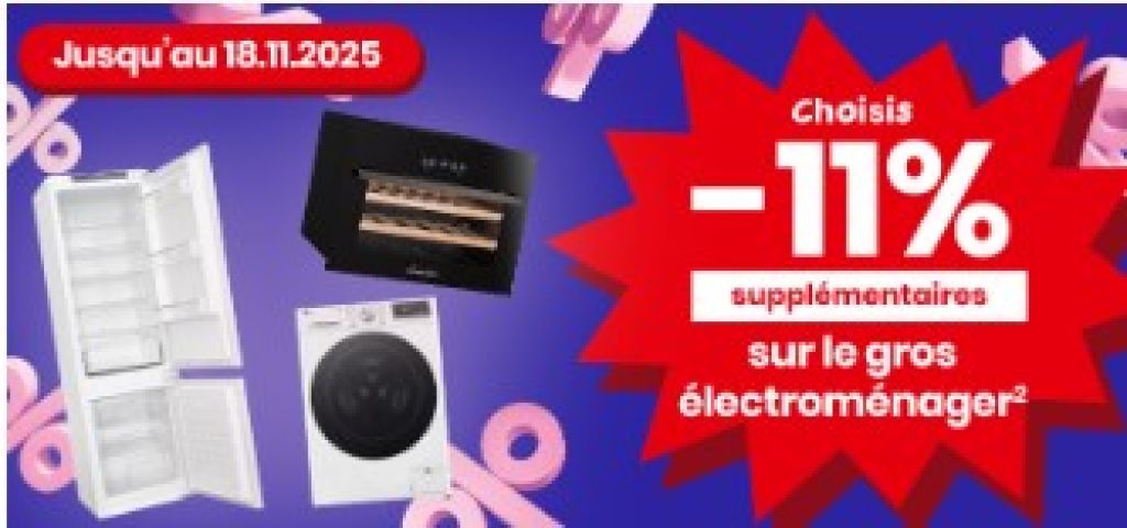 Jetzt bei Conforama Schweiz sparen: Bis zu 11 % Extra-Rabatt auf ausgewählte Großgeräte für Küche und Haushalt! Entdecken Sie hochwertige Geräte für Ihr Zuhause – von Kühlschränken über Waschmaschinen bis hin zu Kochfeldern und Mikrowellen.