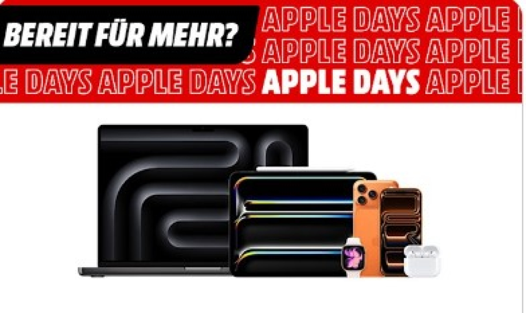 Die Aktion gilt auf Produkte im Apple Days-Sortiment und ist nur für kurze Zeit verfügbar. Ob für Arbeit, Freizeit oder Schule – entdecke starke Angebote und sichere dir deine Wunschgeräte zu reduzierten Preisen.