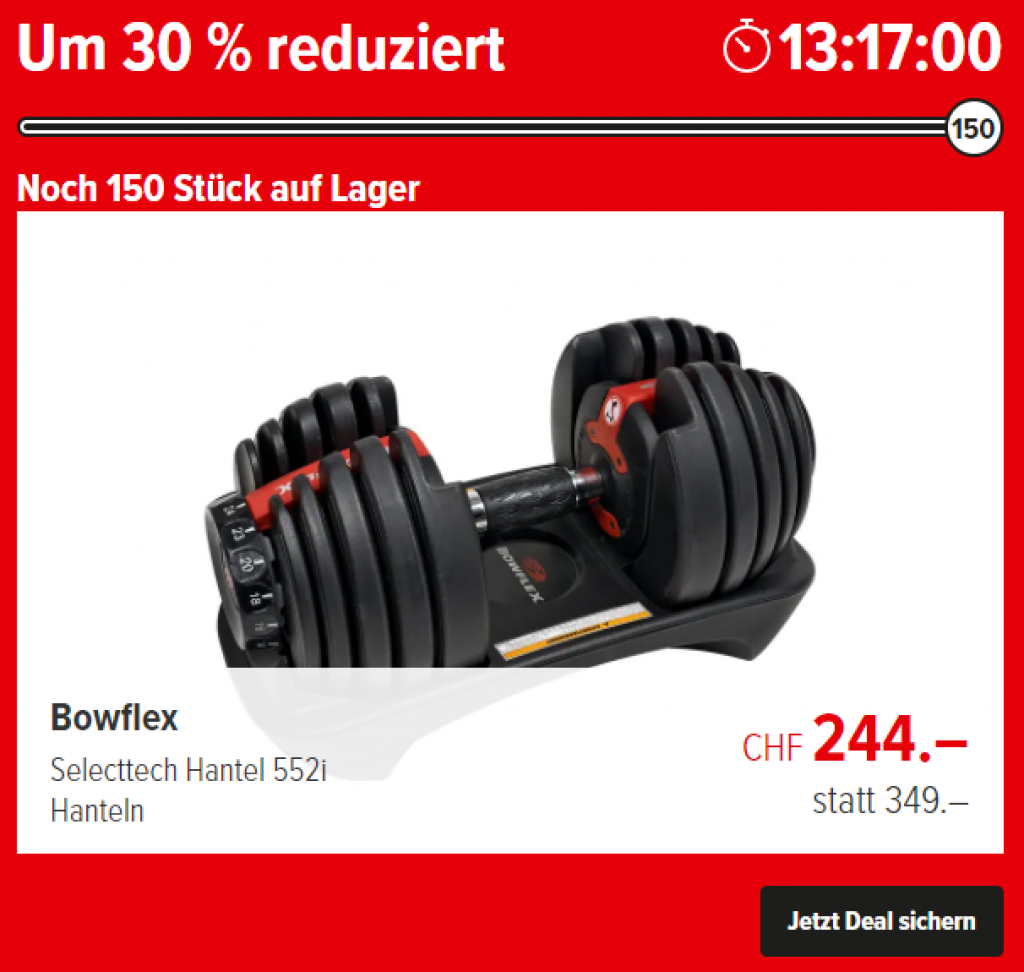 Beispielweise gibt es die BOWFLEX SelectTech 552i Hanteln für CHF 244.- statt CHF 260.- (vgl. powershop).