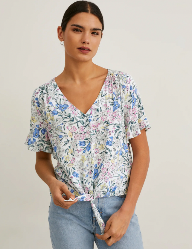 Die Blusen aus leichtem Stoff mit weissem und schwarzem Blumen Print haben ein cooles Knotendetail an der Saumpartie. Sie haben einen Relaxed Fit, einen V-Ausschnitt und Halbärmel. Sie bestehen aus nachhaltigen LENZING™ ECOVERO™ Viskosefasern.