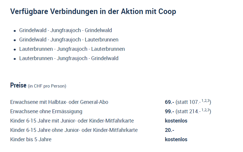 Mit dem Code JJ3454 gibts derzeit bis zum 30.11. bis zu 50% Rabatt auf den Jungfraujoch-Besuch. Der Code berechtigt zum Kauf von maximal 4 Biletten für die Fahrt Grindelwald - Jungfraujoch oder Lauterbrunnen - Jungfraujoch und zurück.