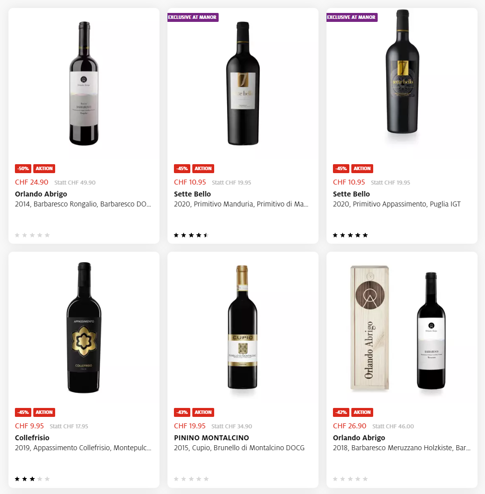 Bei Manor könnt ihr aktuell von bis zu 50% Rabatt auf italienische Weine profitieren! Man findet aktuell 34 Weine mit über 30% Rabatt, zur Auswahl stehen aber insgesamt über 320 Weine.
