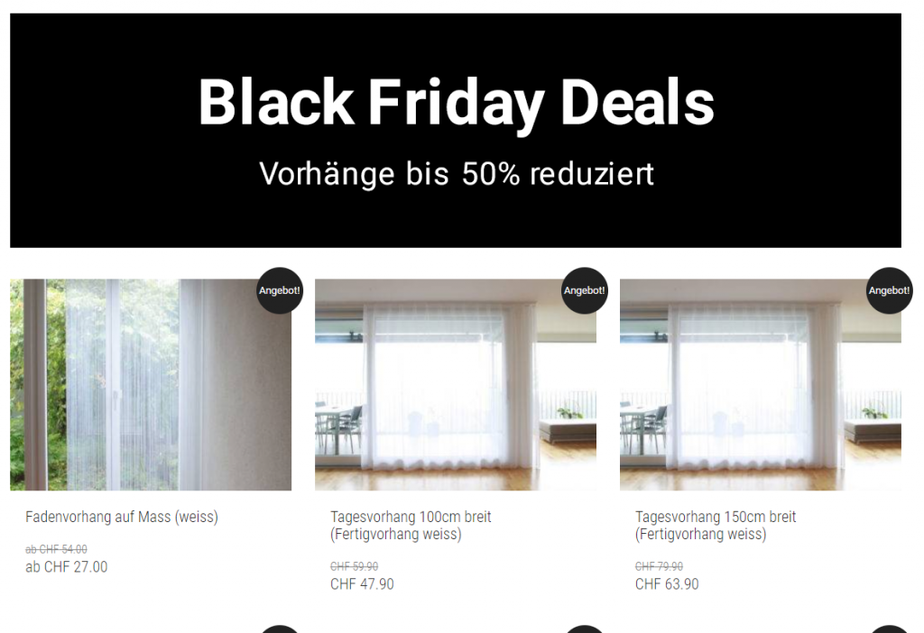 50% gibt es auf Fadenvorhänge nach Mass. Fertigvorhänge sind um 20% reduziert.