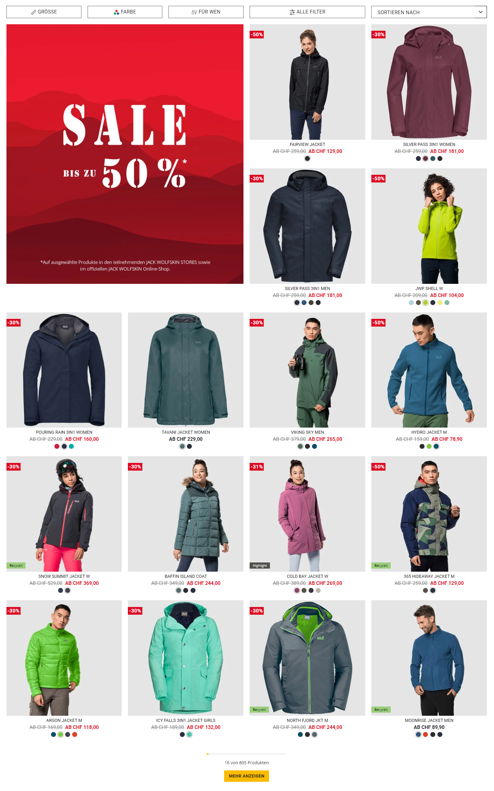 Es findet gerade ein grosser Sale bei Jack Wolfskin statt. So sind über 800+ Artikel im Sale, viele davon sogar mit 50%. Ab CHF 150.- Bestellwert ist die Lieferung kostenlos. Die Aktion überbietet sogar zum Teil die Preise vom Black Friday, daher sicherlich kein schlechtes Angebot 🙂 Der Sale läuft noch bis zum 21.02.2021.