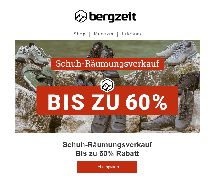 Bei Bergzeit gibt es nur heute eine Schuh-Rabatt-Aktion.