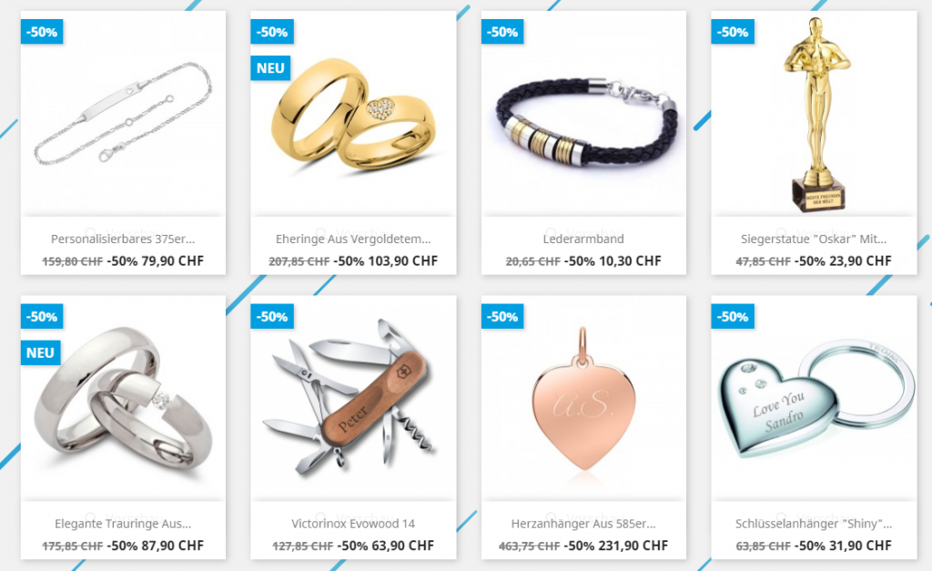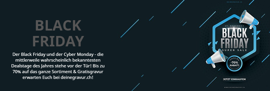 Bei deineGravur.ch gibt es zum Black Friday bis zu 70% Rabatt auf ausgewählte Artikel. Durchschnittlich sind die Aktionsartikel um 50% reduziert. Es muss kein MBW erreicht oder ein Code eingegeben werden. Die Aktionsartikel sind gekennzeichnet.