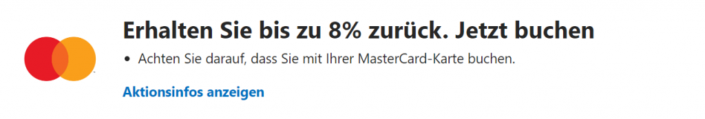 Bei Unterkunfts-Buchungen bis zum 31. August auf der booking.com Website (nicht über die App gültig!) gibt es einen 6-8% Cashback wenn mit einer Schweizer Mastercard bezahlt wird. Der Cashback wird transparent auf dee Platform ausgewiesen wenn über den Link booking.com/mastercardCH gebucht wird