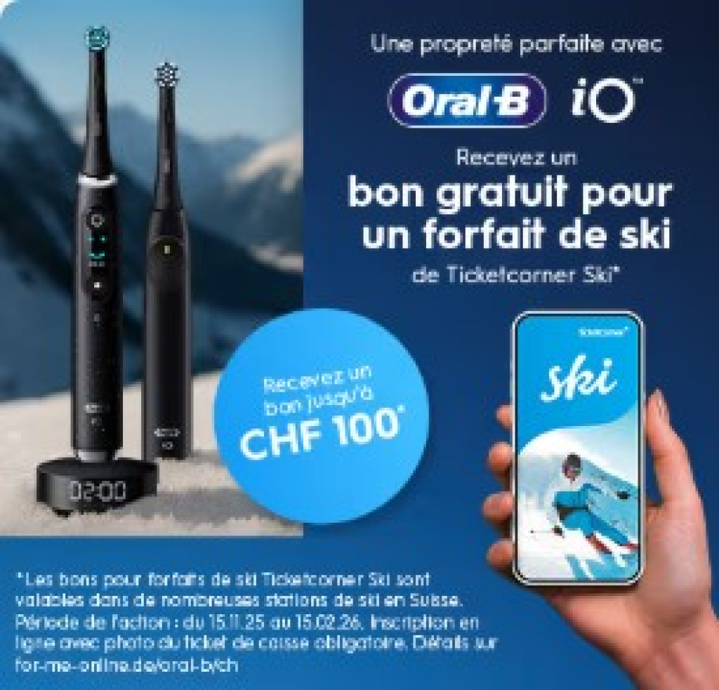 Jetzt Zähne putzen und gleichzeitig für den nächsten Ski-Ausflug sparen! Im Rahmen der aktuellen Oral-B Aktion erhältst du beim Kauf einer elektrischen Zahnbürste der Serie Oral-B iO 2 bis 10 einen Ticketcorner Gutschein im Wert von bis zu CHF 100.–.