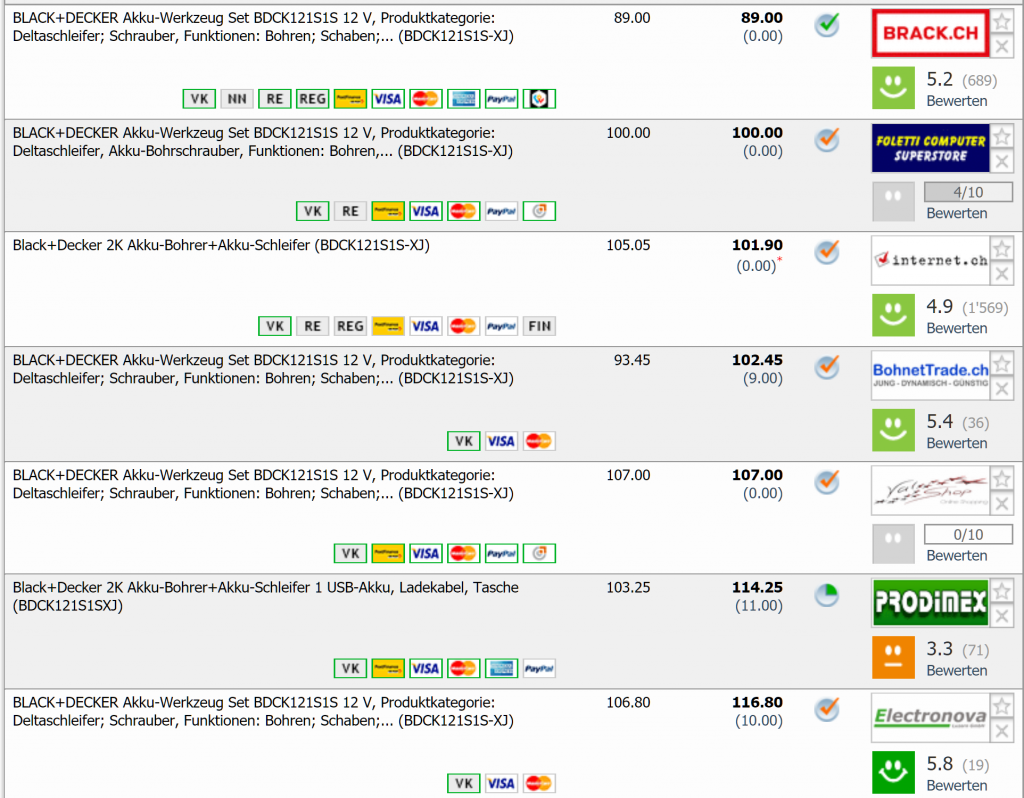 Bei brack.ch gibt’s gerade das BLACK & DECKER 12 V Akku-Werkzeugset (BDCK121S1S) für CHF 89.- Zweitbester Preis beträgt CHF 100.- Bestpreis war bis vor kurzem noch bei CHF 129.-