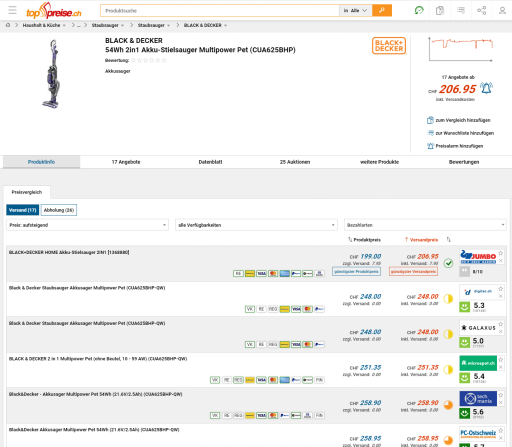 Aktuell gibt es bei Jumbo den Akku-Stielsauger von Black + Decker zum Bestpreis bei Jumbo. In Kombination mit dem Code „2044000007728“ gibt es nochmal 10%, damit kommt man auf den Preis von CHF 187.05 inklusive Lieferung.
