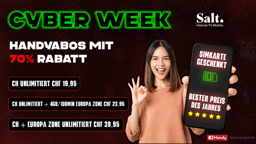 Auf handy-abovergleich.ch gibt es exklusive Deals mit 70% Rabatt auf Salt und weitere Abos. Diese sind nur auf handy-abovergleich.ch verfügbar mit gratis SIM Karte und Aktivierung. Innerhalb von 7 Tagen nach der Bestellung folgt eine automatische Mail von handy-abovergleich.ch bezüglich der Cashback-Auszahlung und wie diese ablaufen wird.