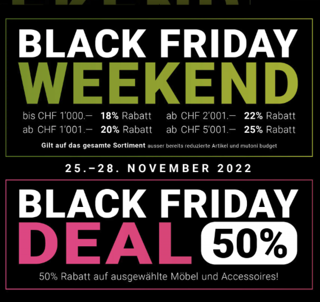 Bis 28. November bietet mutoni.ch 50% Rabatt auf ausgewählte Möbel und Accessoires und bis zu 25% Rabatt auf alle Artikel (ausgenommen bereits reduzierte Artikel und die mutoni budget Linie).